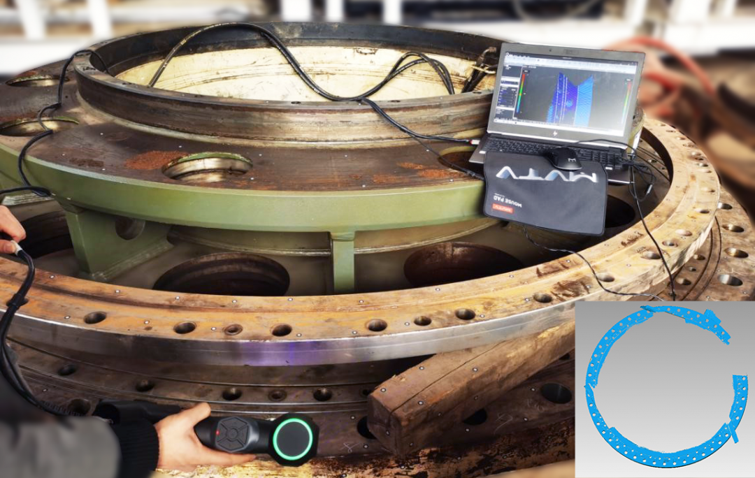 客戶為西南某制造企業,有一圓柱形工件(直徑3m),因已使用一定年限而有所磨損,客戶需要采集該工件數據,獲取外徑、所有孔位尺寸及小孔分度圓等關鍵尺寸,判斷偏差是否在容差范圍內,同時用于安裝在該工件上的配套工件的逆向設計。