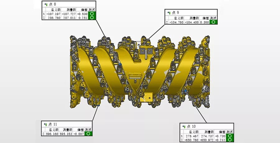 利用銑刨鼓兩端面、筒身特征約束XYZ平移自由度;點8、9、10、11四點約束YZ方向旋轉自由度。最后將掃描數據與CAD數模實現完全約束。(點8、9、10、11的單點偏差分別如下圖所示)