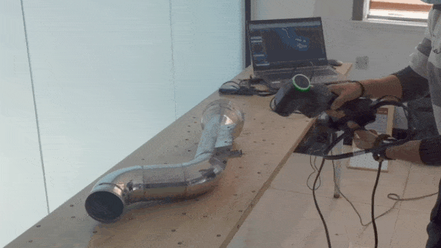 ▲將管件放在貼有標(biāo)志點(diǎn)的桌面上,使用RigelScan掃描,用時不到1分鐘,即可得到完整的管件三維數(shù)據(jù)