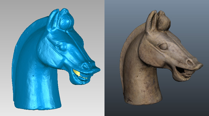2、后期對文物外觀拍照,通過ArtMapping軟件將點云與影像自動配準融合,可以迅速得到單體文物帶紋理模型,即可還原文物的真實外觀。